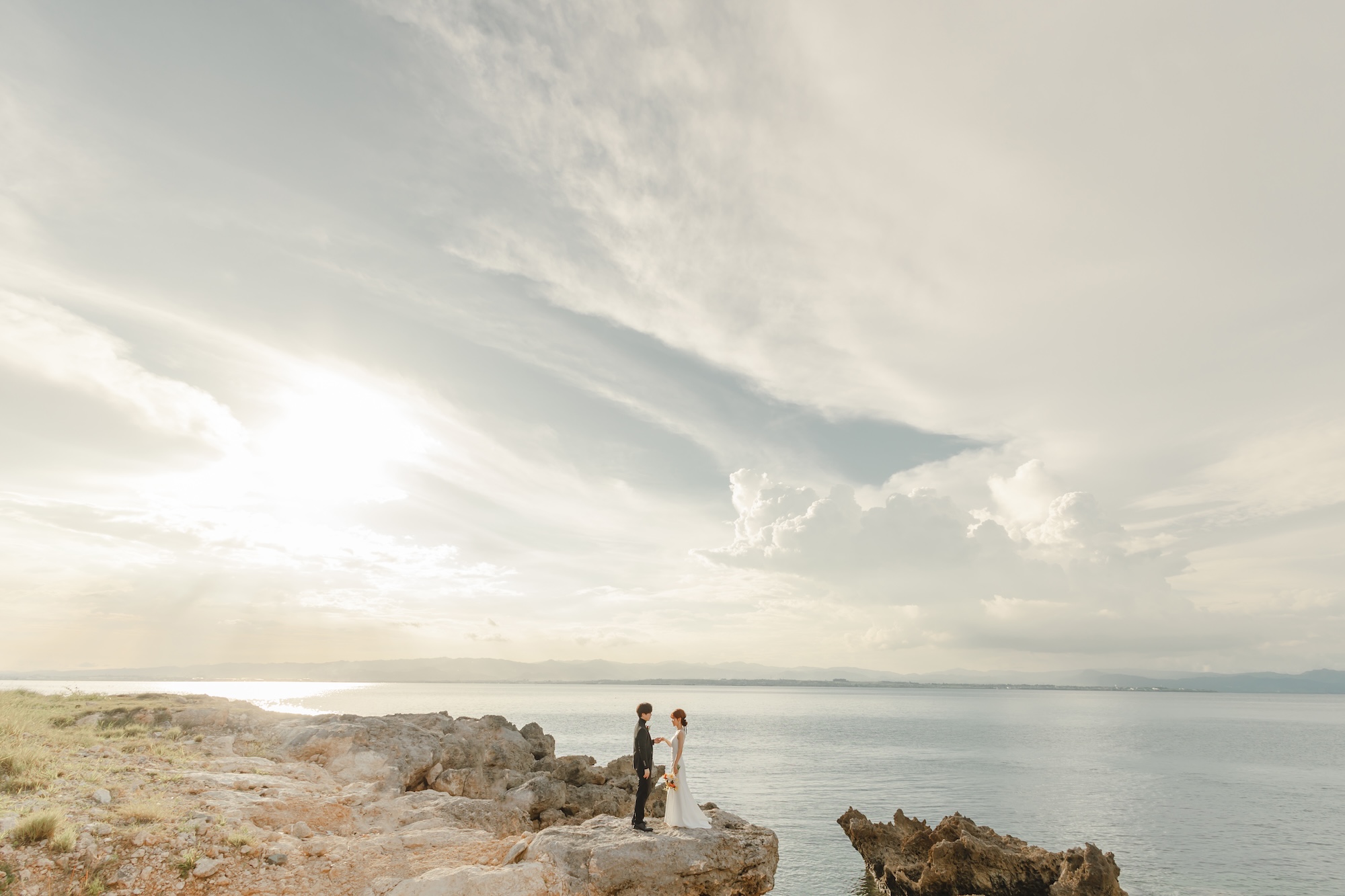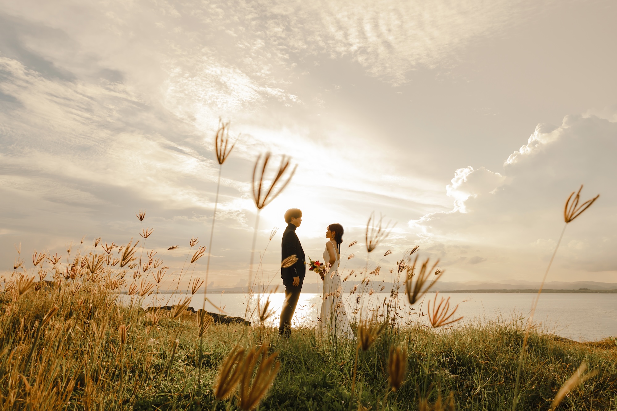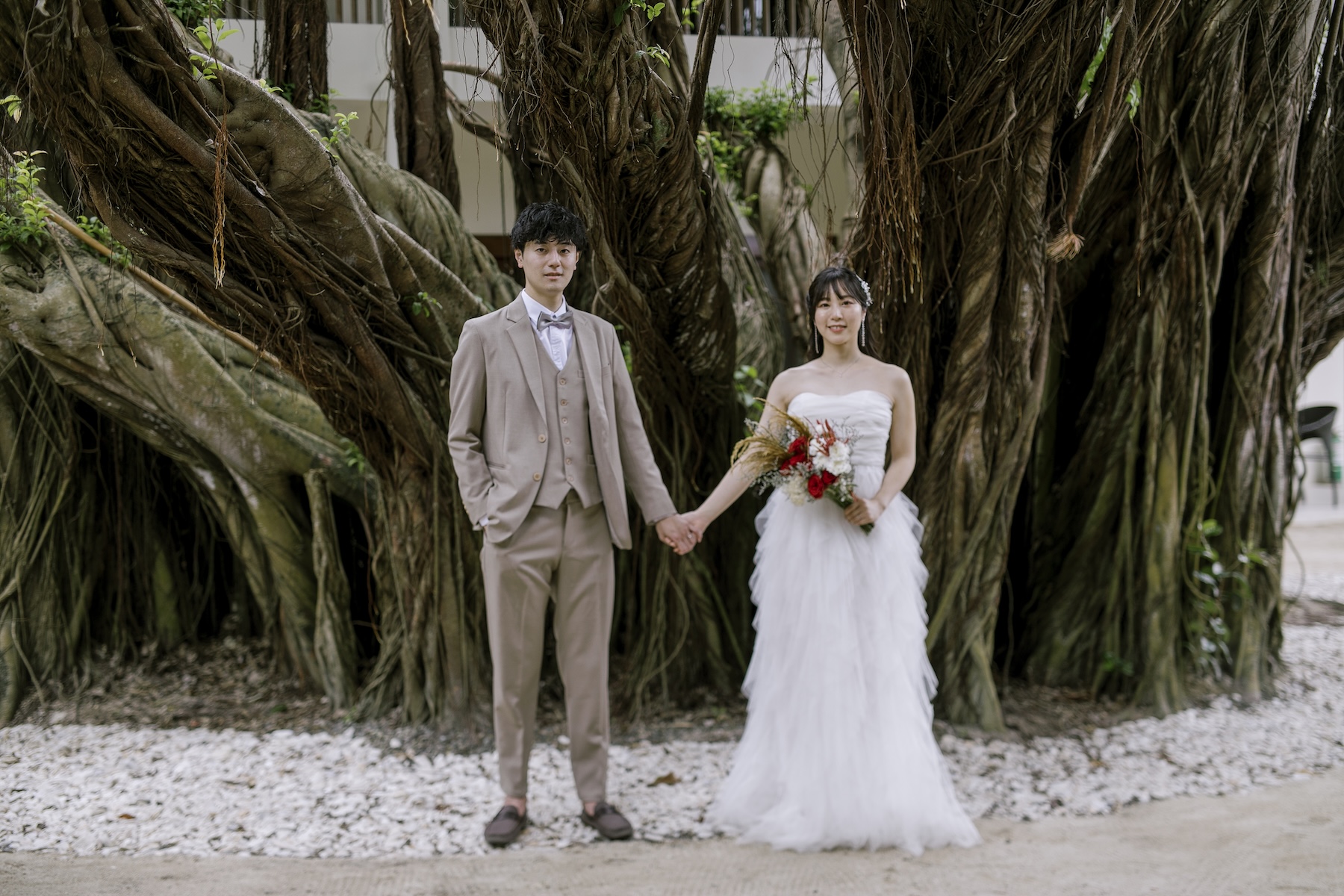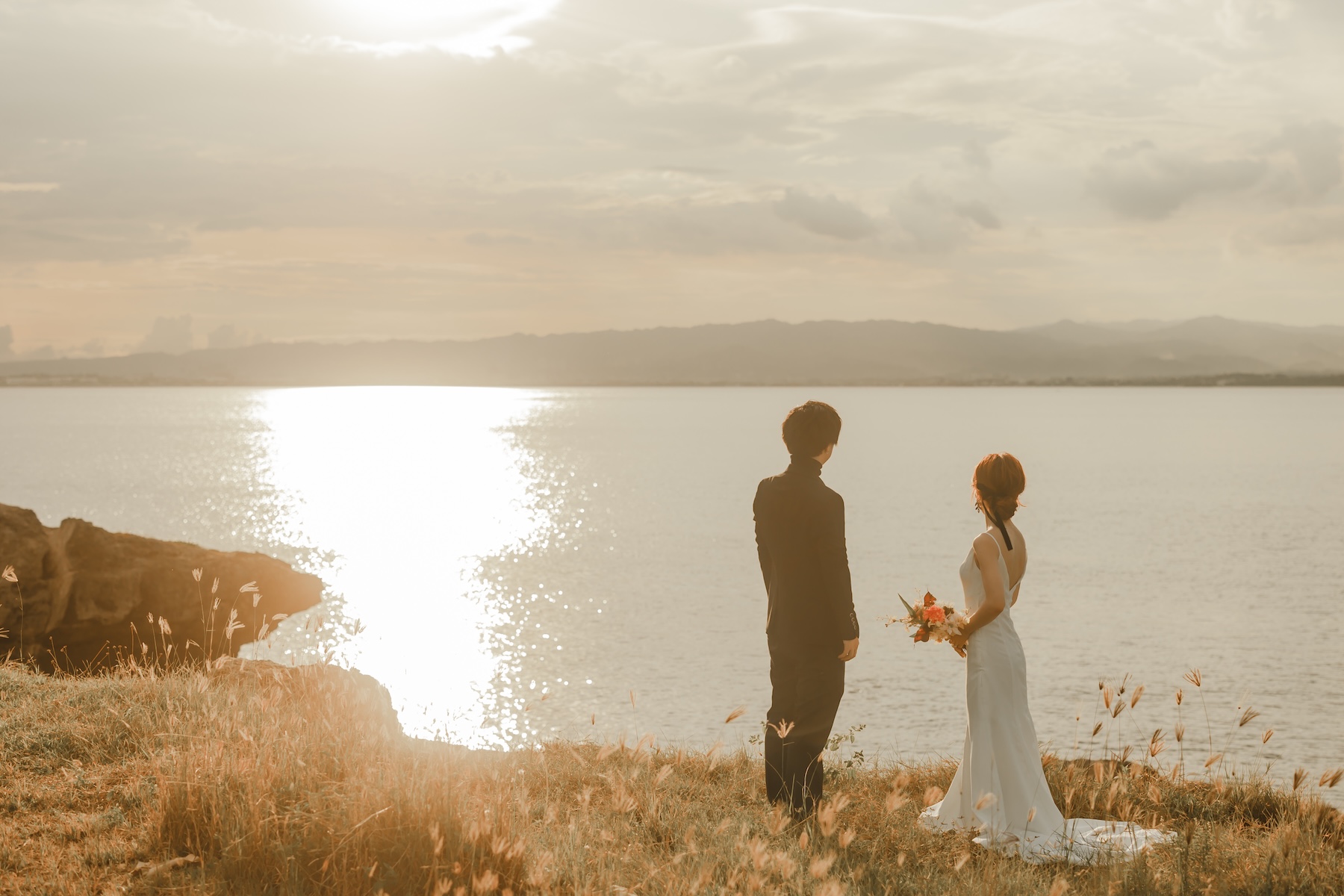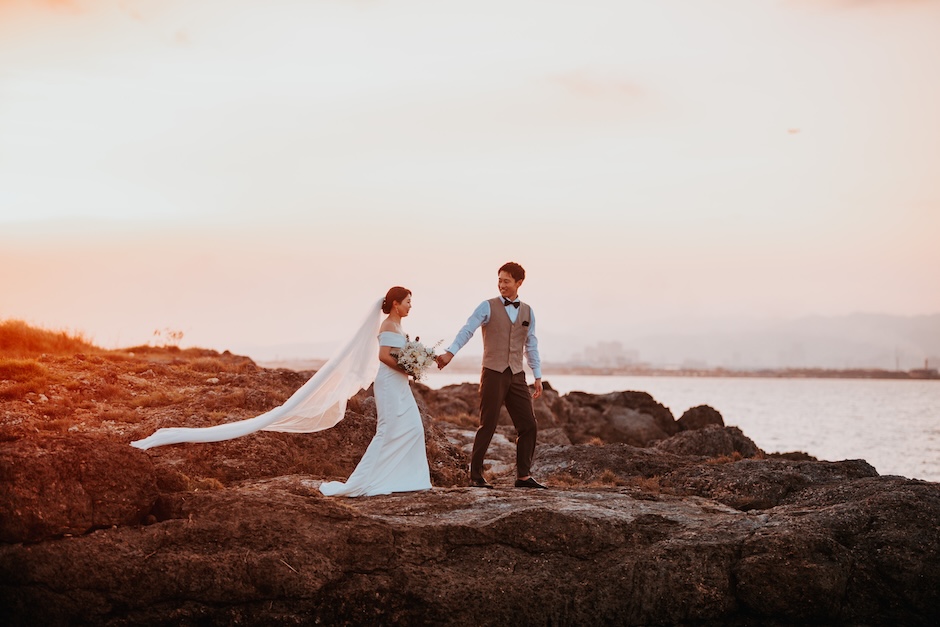 ホテル → タウン → サンセットの移動撮影。ドレス2着・タキシード・ヘアチェンジ付・全データ(300カット)納品。
