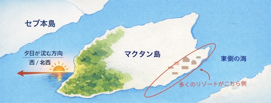 • マクタン島では海に沈む夕日が見られる場所は限られている